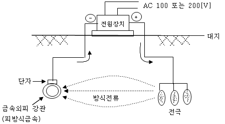 직류 전원 장치를 이용하여 방식 전류를 공급하는 방식으로, 희생양극법과 유사한 원리를 가짐