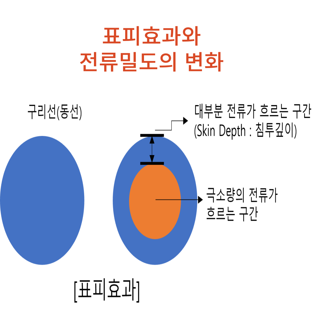 - 표피효과로 인해 전류는 특정 표면 두께(표피두께) 부분에 집중적으로 흐르며, 이로 인해 유효 단면적이 감소하고 도체의 저항이 증가한다.